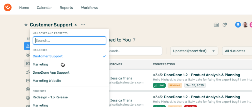 Our goal was to help you navigate your Projects and Mailboxes more easily and have more insight into ongoing work without the need of drilling down into any particular Task or Conversation. That’s why you’re now able to jump to any Project or Mailbox you have access to without needing to go back to Home first. Just click on the arrow and find the Project or Mailbox you’d like to jump to. Typing in the first few letters of its name helps you find it more quickly.