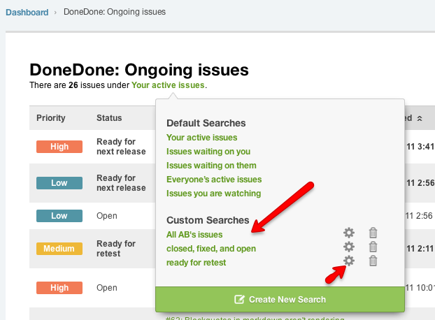 In the old DoneDone, the search feature on the Project Landing page did the trick, albeit, in some incomplete ways. You couldn’t do some simple things, such as deleting erroneous searches, and it was hard to predict what your results might be because the list box half-empty half-full effect.