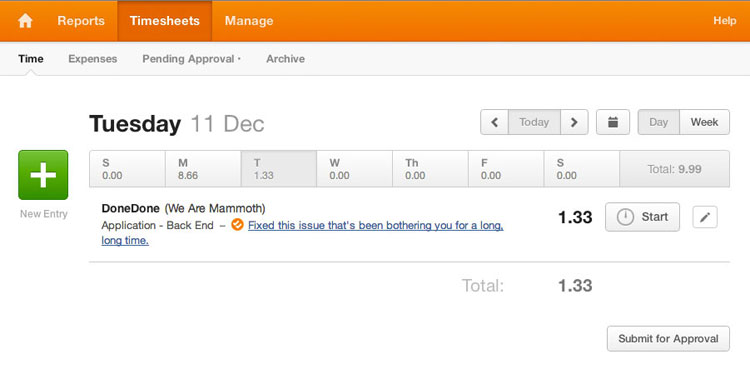 In addition, you can use Harvest’s nifty timer feature to start and stop the timer. This is great for companies that use DoneDone religiously during the QA or pre-release phase of a project. These times are often hectic, and for developers, time tracking tends to lag for days or weeks. With this new feature available per issue, you don’t have to “break form” to track time as you’re fixing bugs.