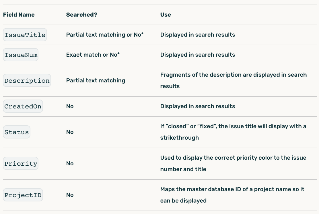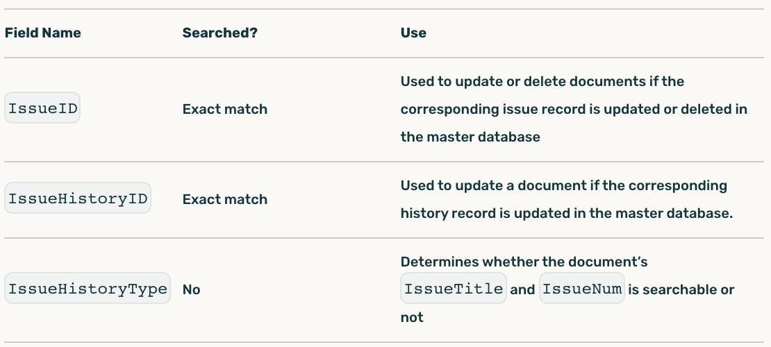 We include the IssueHistoryType so that we can track whether the IssueTitle and IssueNum should be indexed (as we just described earlier). When the document is initially added to the search database, we don’t need to access this field. But, when an issue is updated, we will. More on this in our next post.
