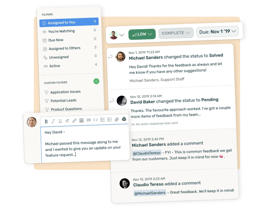 Pricy enterprise customer service tools are painful to set up and costly. Stick with the “need-to-have” features for a fraction of the price. A no-fuss ticket portal, easy searching & filtering, private commenting, out-of-office responses, saved replies, customer histories, and more.