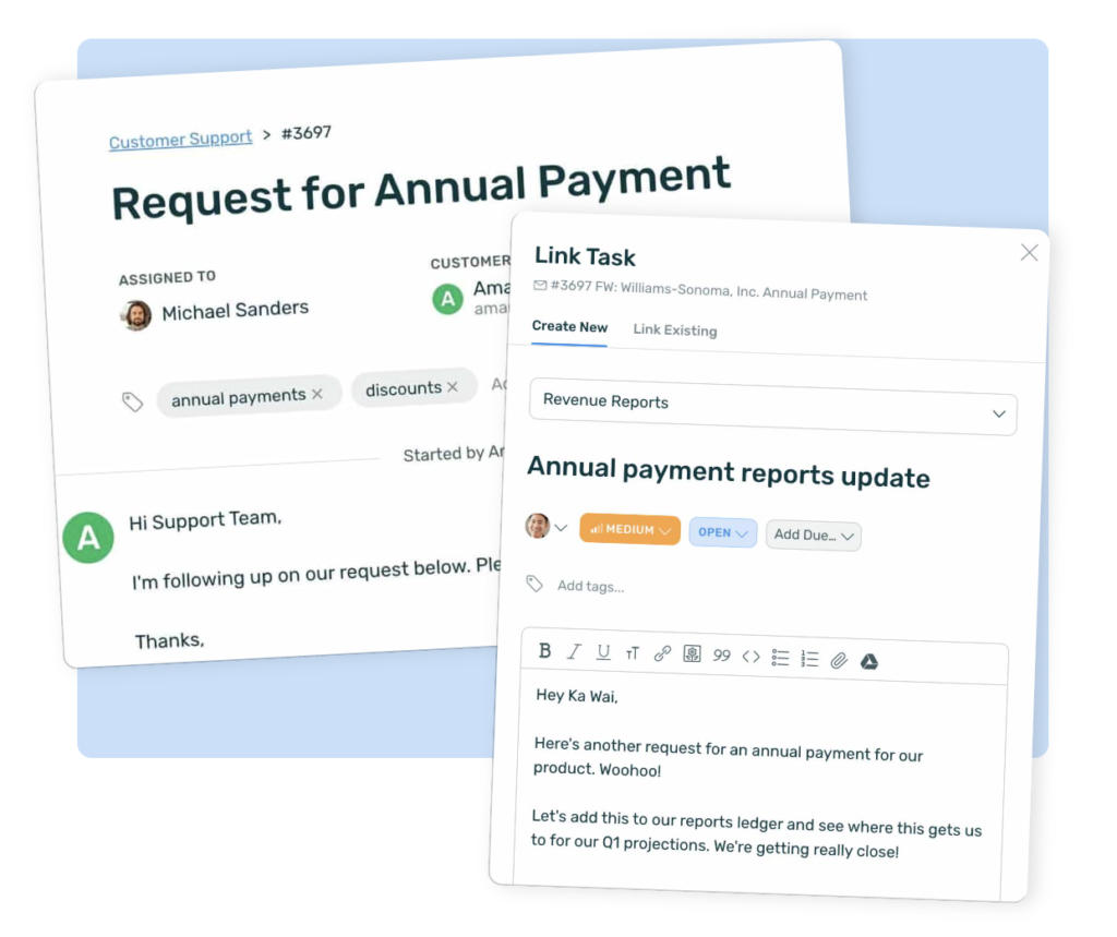 Link conversations to internal tasks so your customer support staff and back office team work together harmoniously while keeping your customers in love with your service.